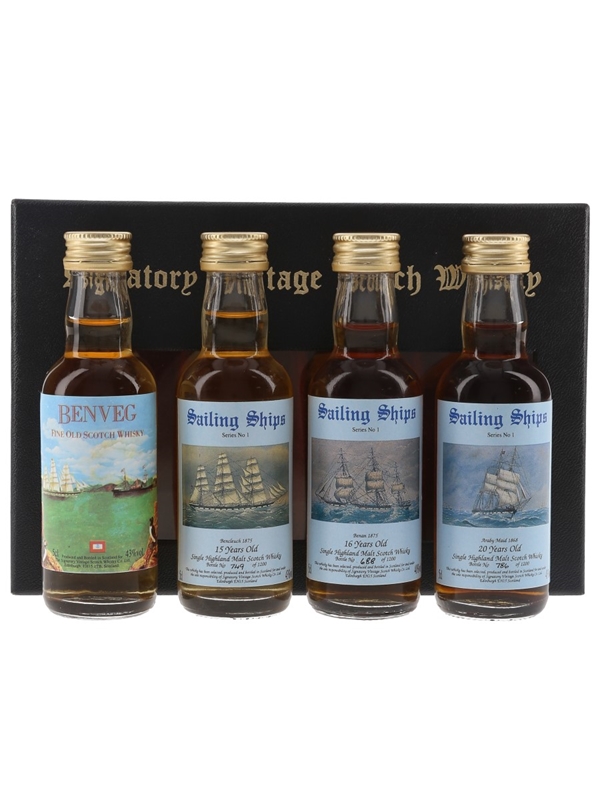 This set contains four miniature bottles of Scotch Whisky, bottled by Signatory Vintage as part of Sailing Ships Series No.1. The three single malts commemorate three Ben Line sailing ships: