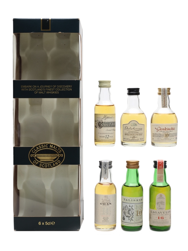 The Classic Malts set contains six miniature bottles of Single Malt Scotch Whisky: