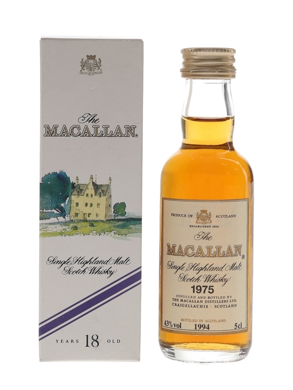 A miniature bottle of The Macallan 1975 Single Malt Scotch Whisky. This was distilled in 1975 and bottled in 1994.