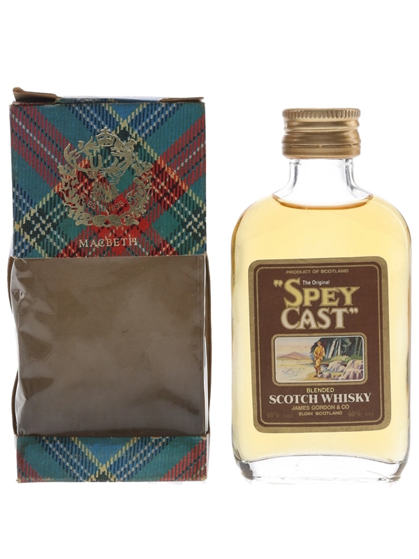 A miniature bottle of Spey Cast The Original Blended Scotch Whisky, bottled by James Gordon & Co. We estimate this was bottled in the 1980s.