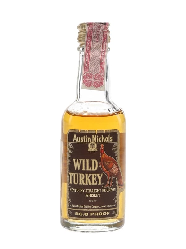 A miniature bottle of Wild Turkey Kentucky Straight Bourbon Whiskey, bottled by the Austin Nichols Distilling Company, Lawrenceburg, Kentucky. This was imported to the UK by Atkinson, Baldwin And Co. The bottling code indicates this bottle was made in 1983.