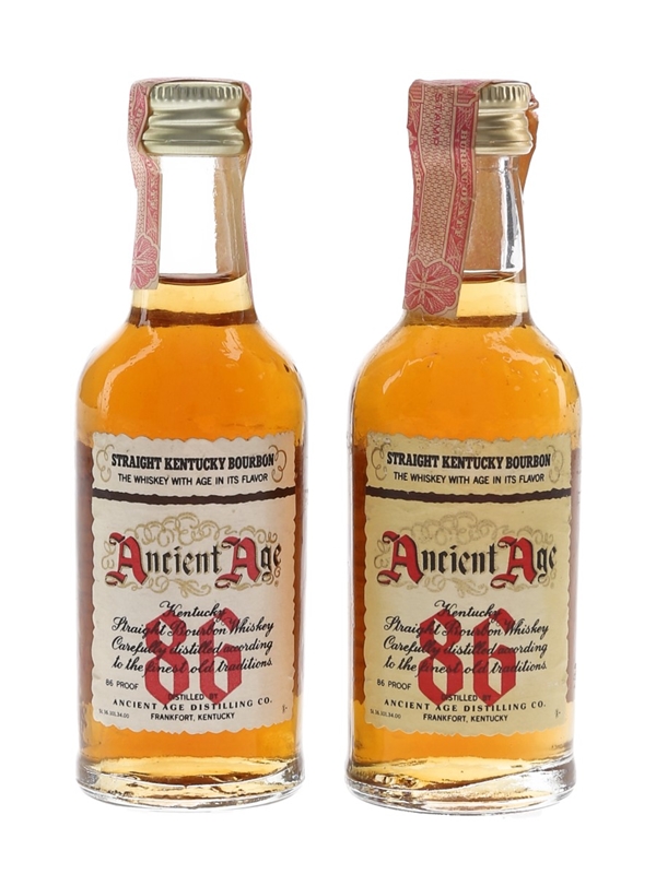 This lot contains two miniature bottles of Ancient Age 86 Straight Kentucky Bourbon, distilled by Ancient Age Distilling Co., Frankfort. We estimate these were bottled in the early 1980s.