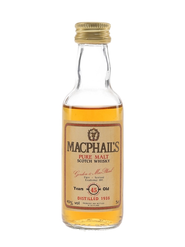 A miniature bottle of MacPhail's 45 Year Old Pure Malt Scotch Whisky. This was distilled in 1938 and bottled by Gordon & MacPhail.