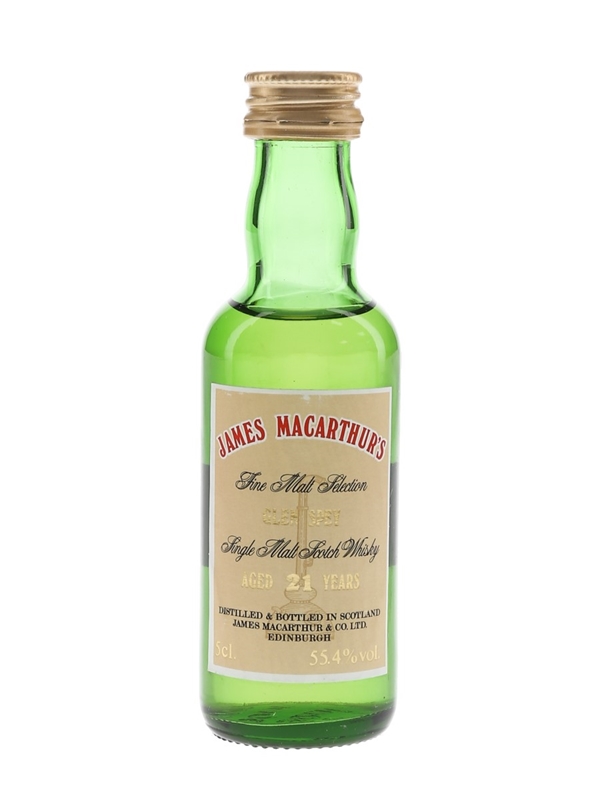 A miniature bottle of Glen Spey 21 Year Old Single Malt Scotch Whisky, bottled in 1991 at 55.4% ABV by James MacArthur for the Mini Bottle Club (UK).