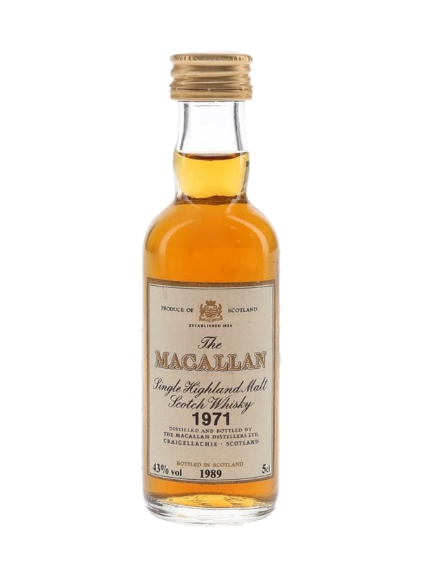 A miniature bottle of The Macallan 1971 Single Highland Malt Scotch Whisky. This was distilled in 1971 and bottled at 43% ABV in 1989.