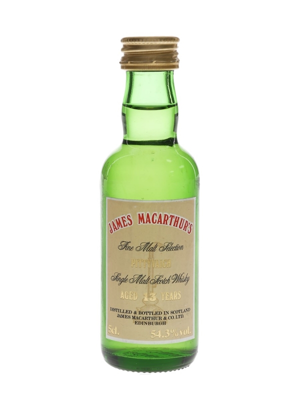 A miniature bottle of Pittvaich 13 Year Old Single Malt Scotch whisky bottled by James MacArthur's Fine Malt Selection.