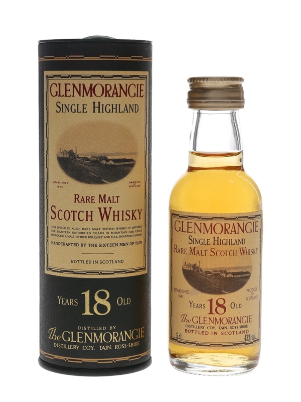 A miniature bottle of Glenmorangie 18 Year Old Single Highland Rare Malt Scotch Whisky. We estimate this was bottled in the 1990s.