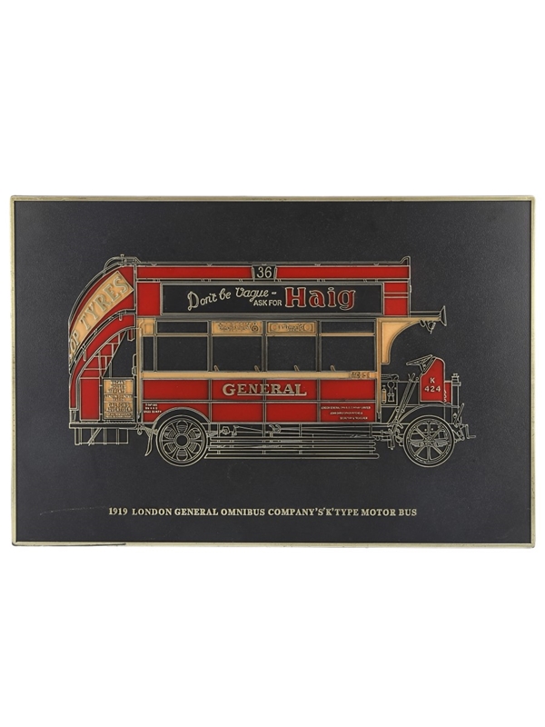 A 1919 London General Omnibus Company Sign, featuring the 'K' type motor bus bearing an advertisement for Haig Whisky with the strapline 'Don't be vague, ask for Haig'.