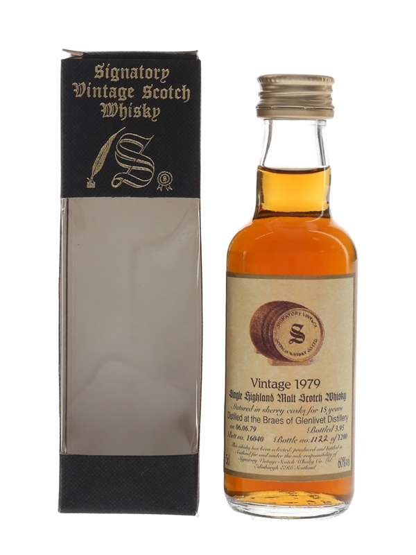 A miniature bottle of Braes of Glenlivet 15 Year Old Single Highland Malt Scotch Whisky. This was distilled on 6 June 1979, matured in sherry casks and bottled in March 1995 by independent bottler Signatory Vintage.