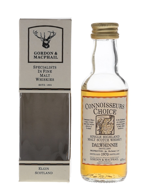 A miniature bottle of Dalwhinnie 1970 Single Highland Malt Scotch Whisky. This was distilled in 1970 and bottled by Gordon & MacPhail as part of the Connoisseurs Choice series. The bottling code indicates this was bottled in 1991.