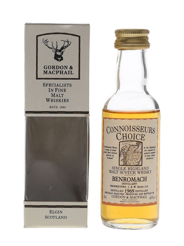 A miniature bottle of Benromach 1969 Single Highland Malt Scotch Whisky. This was distilled in 1969 and bottled by Gordon & MacPhail as part of the Connoisseurs Choice series. The bottling code indicates this was bottled in 1989.