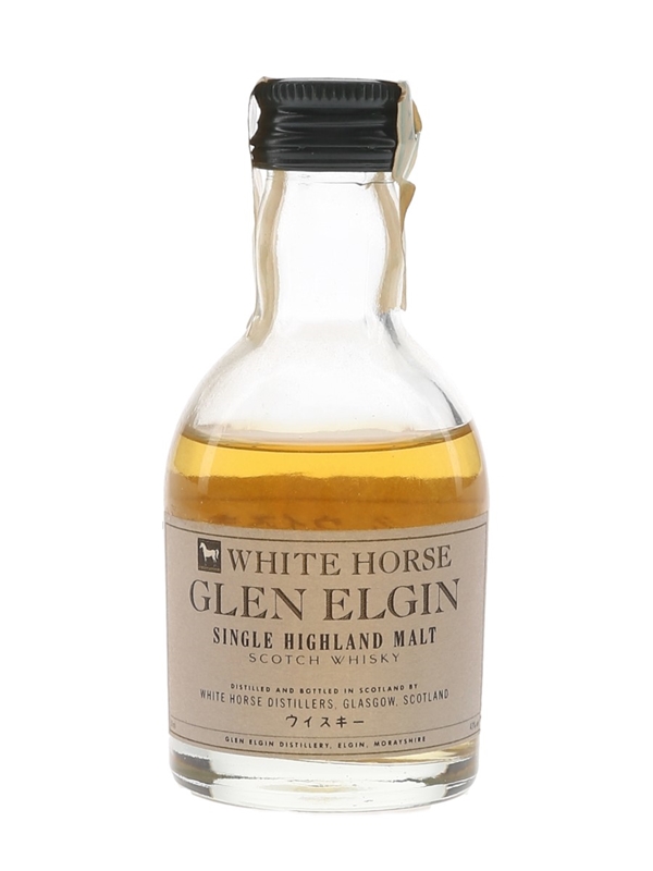 A miniature bottle of Glen Elgin Single Highland Malt Scotch Whisky, bottled by White Horse distillers for the Japanese market.