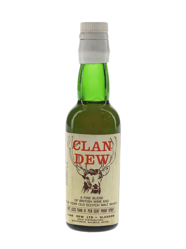 A miniature sample bottle of Clan Dew, a blend of British wine and 5 year old Scotch malt whisky. We estimate this was bottled in the 1970s.