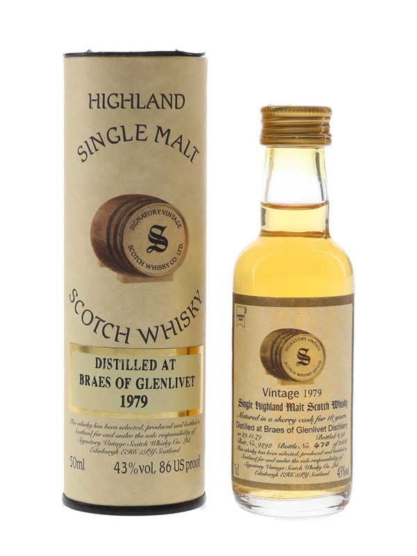 A miniature bottle of Braes of Glenlivet 18 Year Old Single Highland Malt Scotch Whisky. This was distilled on 29 November 1979, matured in a sherry cask and bottled in April 1998 by independent bottler Signatory Vintage.