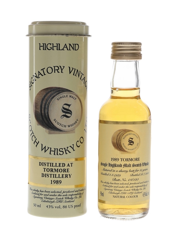 A miniature bottle of Tormore 15 Year Old Single Highland Malt Scotch Whisky. This was distilled on 2 March 1989, matured in a single sherry butt and bottled on 28 July 2004 by Signatory Vintage.