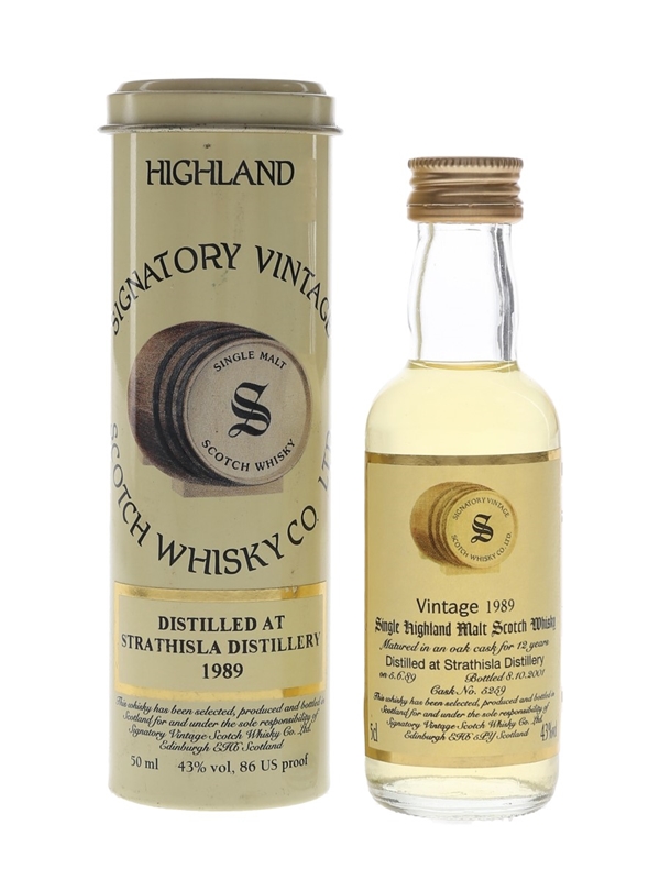 A miniature bottle of Strathisla 12 Year Old Single Highland Malt Scotch Whisky. This was distilled on 5 June 1989, matured in a single oak cask and bottled on 8 October 2001 by Signatory Vintage.