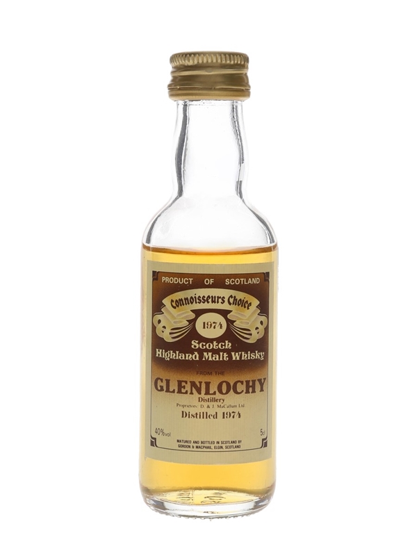 A miniature bottle of Glenlochy 1974 Scotch Highland Malt Whisky bottled by Gordon & MacPhail as part of the Connoisseurs Choice series. We estimate this was bottled in the 1980s.
