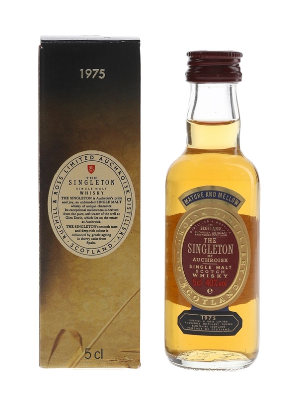 A miniature bottle of The Singleton of Auchroisk 1975 Single Malt Scotch Whisky.