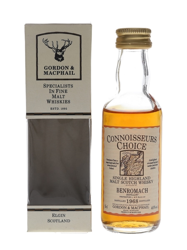 A miniature bottle of Benromach 1968 Single Malt Scotch Whisky. This was distilled in 1968 and bottled by Gordon & MacPhail as part of their Connoisseurs Choice series, we estimate in the 1990s.