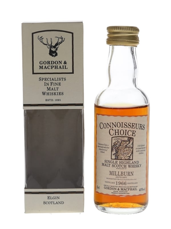 A miniature bottle of Millburn 1966 Single Malt Scotch Whisky. This was distilled in 1966 and bottled by Gordon & MacPhail as part of the Connoisseurs Choice series. We estimate this was bottled in the 1990s.