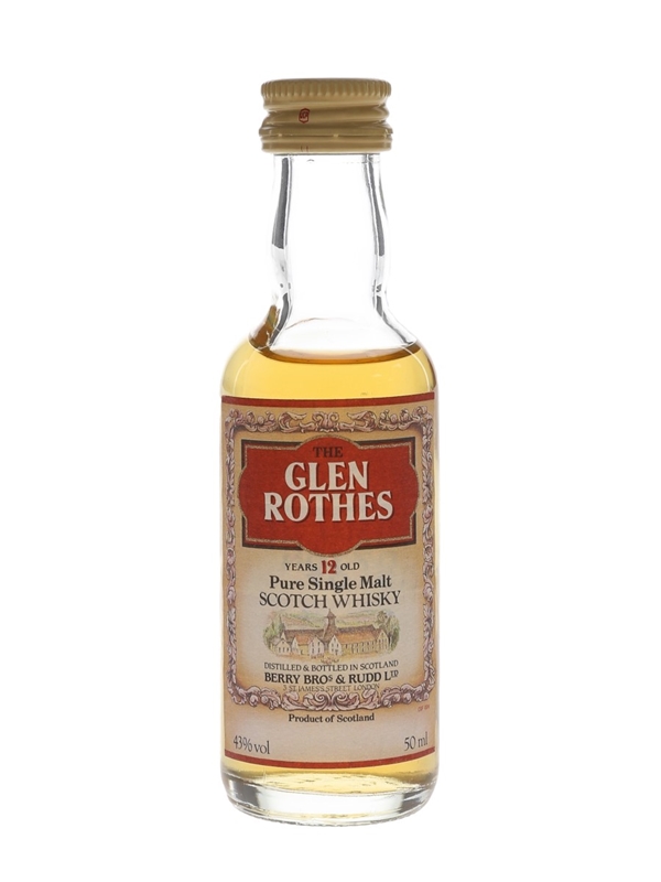 A miniature bottle of The Glen Rothes 12 Year Old Pure Single Malt Scotch Whisky produced by Berry Bros & Rudd Ltd. We estimate this was bottled in the 1990s.