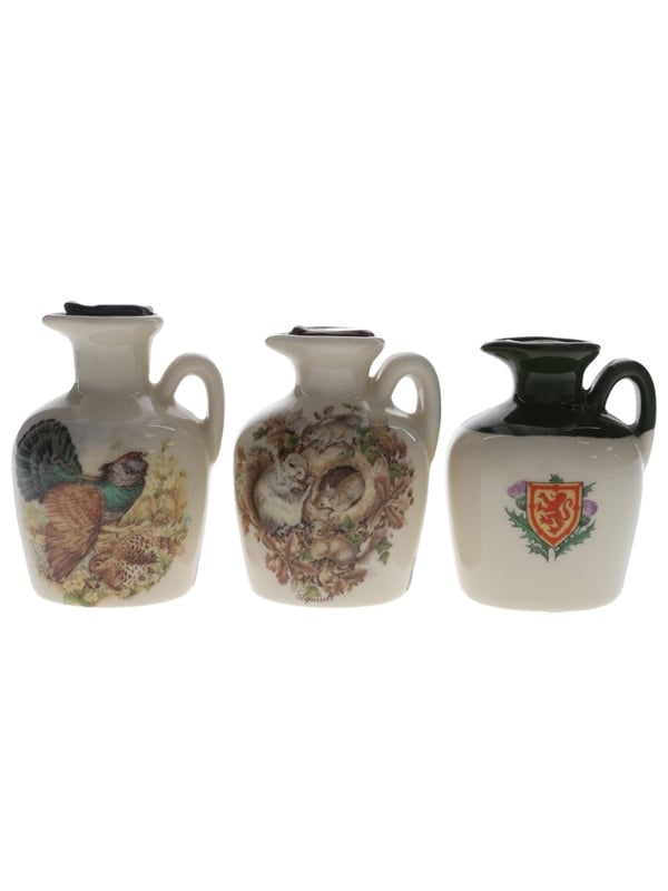 This lot contains three miniature bottles of Glen Fiona Blended Scotch Whisky presented in Lindisfarne ceramic decanters decorated with animals and a coat of arms.