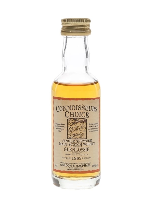 A miniature bottle of Glenlossie 1969 Single Speyside Malt Scotch Whisky. This was bottled by Gordon & MacPhail as part of the Connoisseurs Choice series, we estimate in the late 1980s to early 1990s.