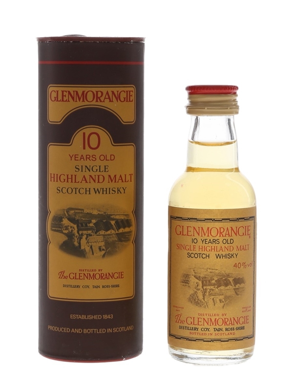 A miniature bottle of Glenmorangie 10 Year Old Single Highland Malt Scotch Whisky. We estimate this was bottled in the 1980s.
