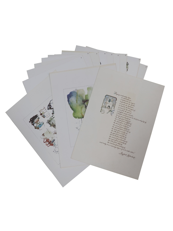 The Remarkable History Of The Macallan, a series of 12 prints tells the story of Scotch whisky and The Macallan in copperplate writing and watercolour pictures. The pictures are reproductions of works by Sara Midda, 1975.