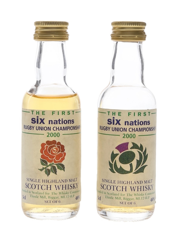 This lot contains two miniature bottles of The Firts Six Nations Rugby Championship 2000 Single highland Malt Scotch Whisky. One label features an English Rose and the other one features a Scottish Thistle.
