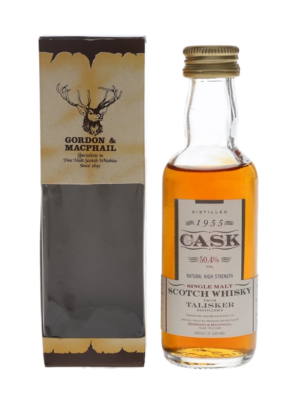 A miniature bottle of Talisker 1955 Single Malt Scotch Whisky. This was distilled on 3 June 1955 and bottled in June 1992 by Gordon & MacPhail as part of their Cask Strength series.