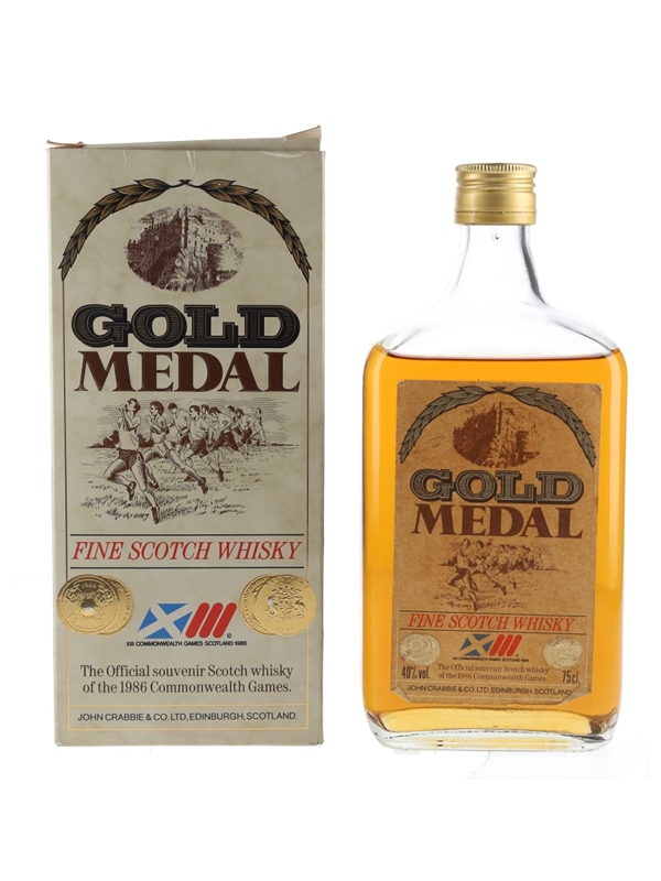 A bottle of Gold Medal Fine Scotch Whisky produced by John Crabbie & Co. Ltd. This was the official souvenir Scotch whisky of the 1986 Commonwealth games in Edinburgh.