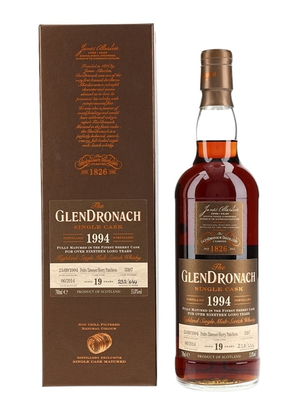 A bottle of The Glendronach 19 Year Old Highland Single Malt Scotch Whisky. This was distilled on 23 September 1994, matured in a single Pedro Ximenez puncheon and bottled in June 2014.