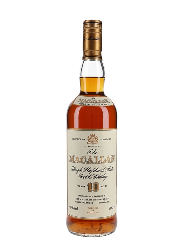 A bottle of The Macallan 10 Year Old Single Highland Malt Scotch Whisky, matured in a sherry wood. We estimate this was bottled in the 1990s.