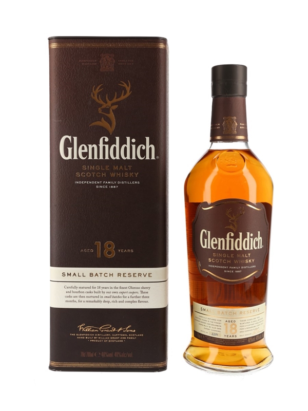A bottle of Glenfiddich 18 Year Old Small Batch Reserve Single Malt Scotch Whisky.