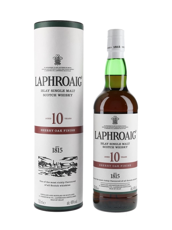 A bottle of Laphroaig 10 Year Old Sherry Oak Finish Single Islay Malt Scotch Whisky. This expression was bottled at 48% ABV in 2021.