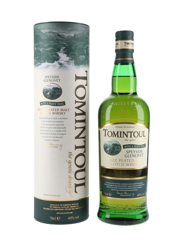 A bottle of Tomintoul Single Peated Malt Scotch Whisky, the Gentle Dram with a Peaty Tang.