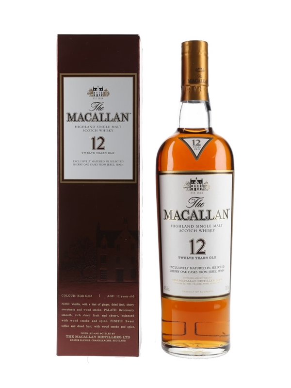 A bottle of the Macallan 12 Year OId Sherry Oak Highland Single Malt Scotch Whisky.
