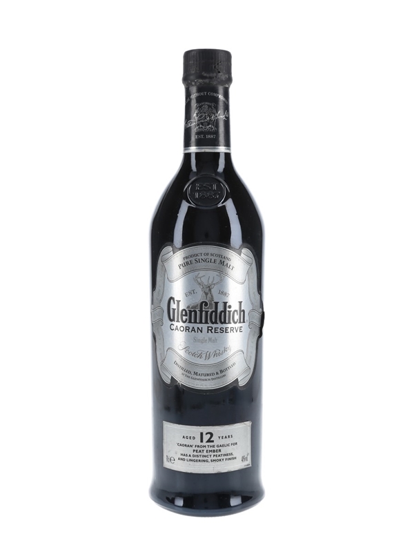 A bottle of Glenfiddich's discontinued Caoran Reserve 12 Year Old Single Malt Scotch Whisky. Subtitled 'Peat Ember', this uses lightly peated barley for a smoky twist on the traditional Glenfiddich character. This is the silver labelled version.