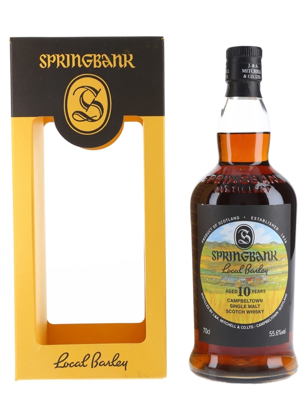 A bottle of Springbank 10 Year Old Local Barley Campbeltown Single Malt Scotch Whisky. This was distilled in June 2010 from Belgravia barley grown on West Backs Farm, matured for 10 years and bottled in December 2020.