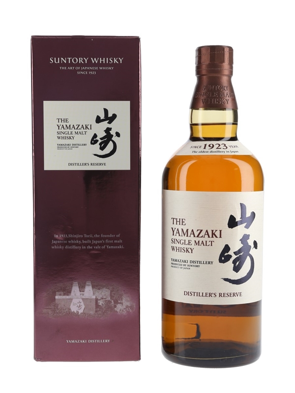A bottle of Yamazaki Distiller's Reserve Single Malt Whisky, a vatting of whiskies aged in three different cask types: wine, sherry and Mizunara oak. This was imported by Morrison Bowmore Distillers Ltd.