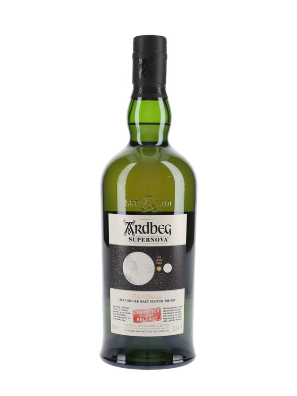A bottle of Ardbeg Supernova The Ultimate Islay Single Malt Scotch Whisky. This is the 2015 Committee Release and was bottled at 54.3% ABV.