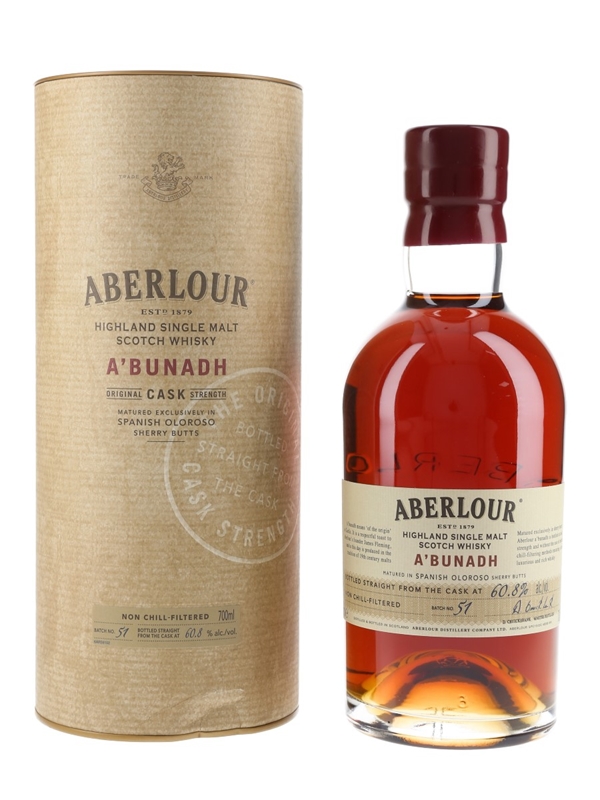 A bottle of Aberlour A'bunadh Batch 51 Highland Single Malt Scotch Whisky, matured in Spanish oloroso sherry butts and bottled at 60.8% ABV.