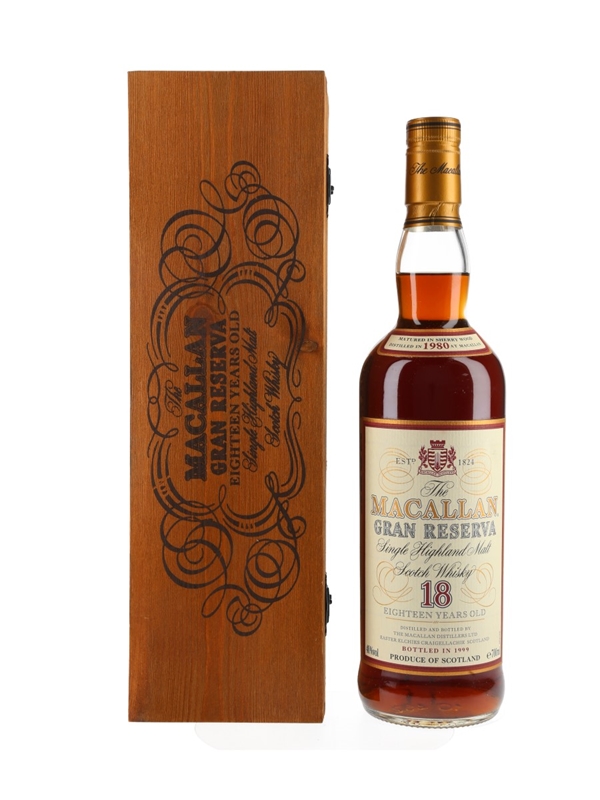 A bottle of The Macallan Gran Reserva 18 Year Old Single Highland Malt Scotch Whisky. This was distilled in 1980, matured in sherry casks and bottled in 1999.