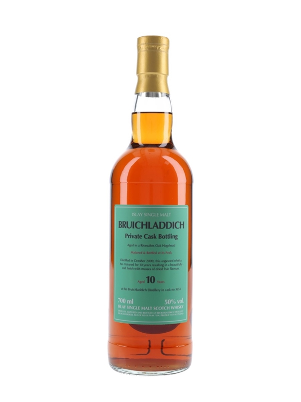 A private cask bottling of Bruichladdich 10 Year Old Islay Single Malt Scotch Whisky. This peated whisky was distilled in October 2009, matured in a single Rivesaltes hogshead and bottled at 50% ABV.