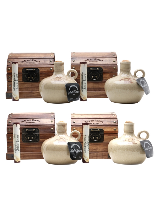 This case contains four ceramic jugs of Isla del Tesoro Extra Añejo rum from Santiago de Cuba. Isla del Tesoro Extra Añejo is a blended rum aged for a minimum of 20 years, and each jug is presented in a wooden treasure chest and a hessian bag.