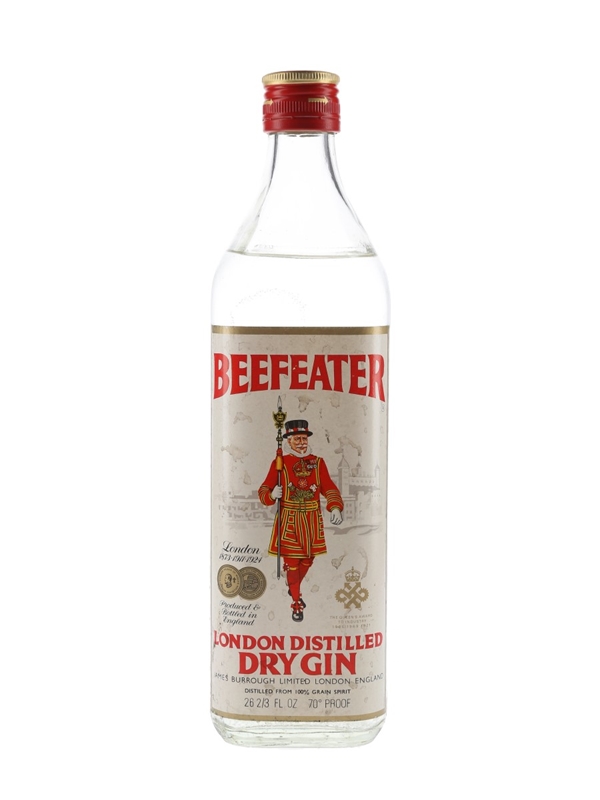 A bottle of Beefeater London Dry Gin, produced by James Burrough Limited. We estimate this was bottled in the 1970s.