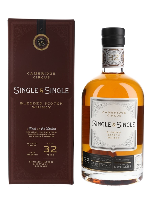 A bottle of Cambridge Circus 32 Year Old, a blend of six single malt whiskies from Macallan, Highland Park, Dalmore, Glenfarclas, Glen Elgin and Tormore, bottled at cask strength by Single & Single.