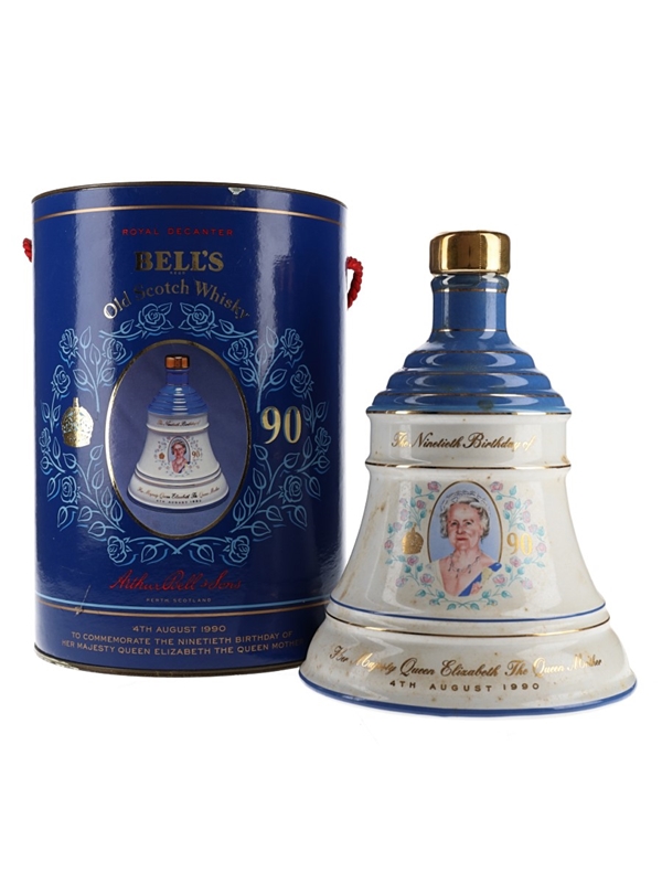 A bottle of Bell's Old Scotch Whisky presented in a ceramic dencater released to celebrate the 90th birthday of the Queen Mother in 1990.