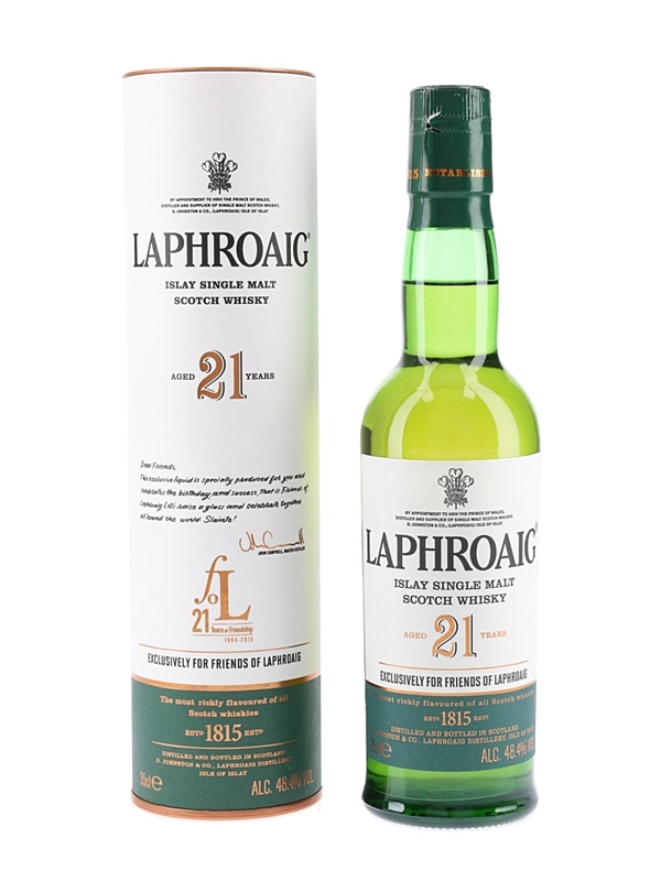 A 35cl bottle of Laphroaig 21 Year Old Islay Single Malt Scotch Whisky, an exclusive bottling for the Friends of Laphroaig to celebrate the club's 21st birthday in 2015. This whisky was distilled in 1993 and matured in first-fill bourbon casks.
